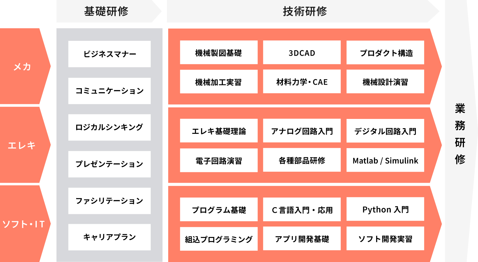 | ソフト・IT技術研修 | IT基礎、アルゴリズム、ソフトウェアテストなどの基礎知識をはじめ、C言語、C#、VBA、Pythonなどのプログラミングも多数。簡単なアプリ開発からマイコンボードを用いた組み込み研修などを通じて、座学だけでなく実際に手を動かします。プログラミング経験/未経験問わず、"コードが分かる" → "コードを書ける" → "実現したいことがデキる"とステップアップを目指します。 |