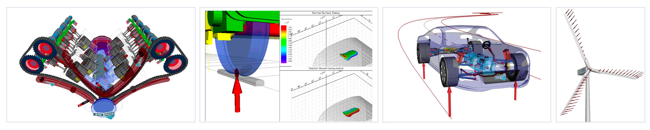 Simpack は自動車、鉄道車両、エンジン、風力タービン等、複数の部品が結合して構成された機械システムの機構運動や運動の過程でどのような力が発生するか数値的にシミュレーションするマルチボディダイナミクス解析ツールです。機構システムの運動、高周波振動や非線形性の強い接触などに精度と信頼性の高い解を提供します。