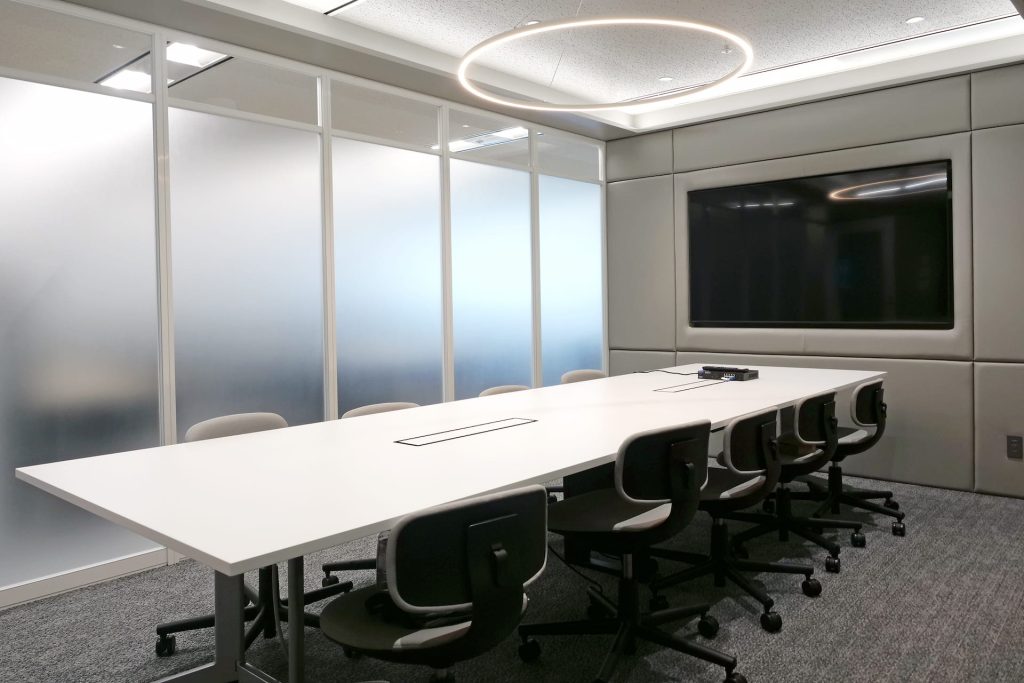 会議室はシンプルなデザイン。円型の照明は新潟イノベーションラボの会議室ともリンクしています。